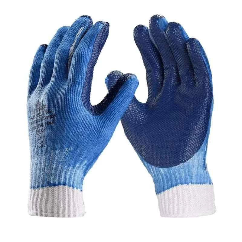 Luva de segurança confeccionada em malha de algodão, revestimento antiderrapante em látex natural reforçado na palma, face palmar e pontas dos dedos.